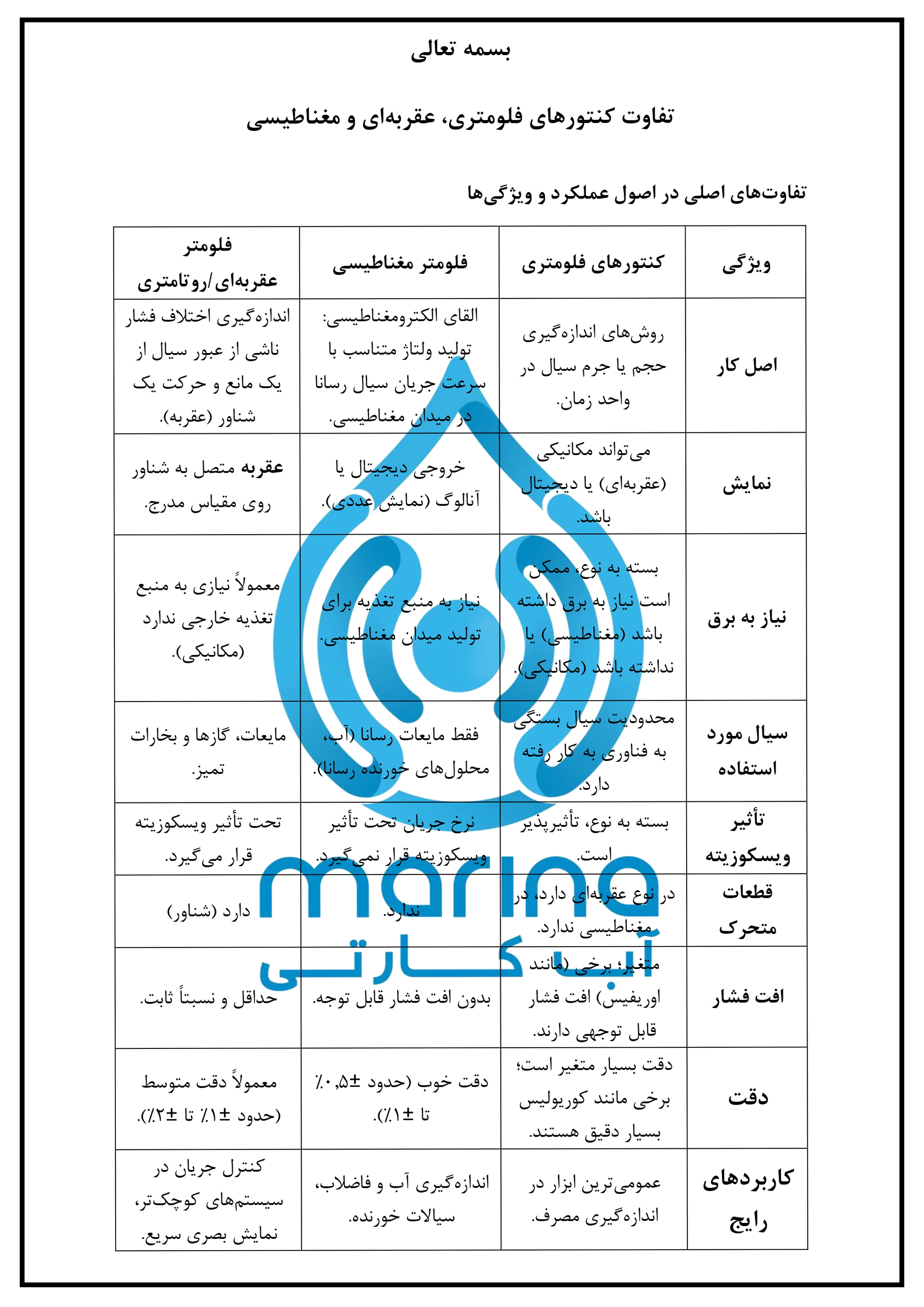 انتخاب بین این کنتورها کاملاً وابسته به نوع سیال، نیاز به دقت، شرایط عملیاتی (فشار و دما) و وجود منبع تغذیه است. اگر سیال شما رسانا و تمیز است و به افت فشار اهمیت میدهید، فلومتر مغناطیسی برتری دارد. اگر به یک نمایشگر بصری ساده و ارزان بدون نیاز به برق نیاز دارید، فلومتر عقربهای/روتامتری مناسب است. در نهایت، هرچند اصطلاح “فلومتری” کلی است، اما برای کاربردهای حیاتی و پیچیده، تکنولوژیهای پیشرفتهتر با خروجی الکترونیکی مانند مغناطیسی یا کوریولیس ترجیح داده میشوند تا اندازهگیری قابل اطمینانتری ارائه دهند.